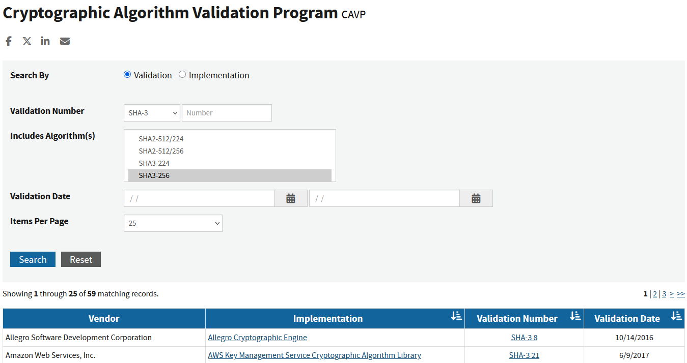 Each entry on the validated algorithms list identifies the vendor, the specific algorithm and mode, supported parameters such as key sizes, the certificate number, and any caveats or operational notes. Practitioners can use this list to confirm that a library or hardware core has a validated implementation of an approved algorithm.